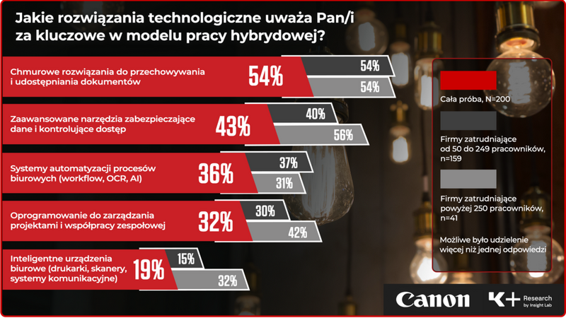 W 2025 roku firmy znacznie precyzyjniej identyfikują, jakie technologie są kluczowe dla efektywnej pracy hybrydowej. W badaniu najczęściej wskazują na chmurowe rozwiązania do przechowywania i udostępniania dokumentów (54% ogółem) oraz zaawansowane narzędzia zabezpieczające dane i kontrolujące dostęp (43%). Szczególnie w przypadku dużych firm popularnością cieszy się także oprogramowanie do zarządzania projektami i współpracy zespołowej (42%), a także inteligentne urządzenia biurowe, takie jak drukarki, skanery, czy systemy komunikacji (32%).