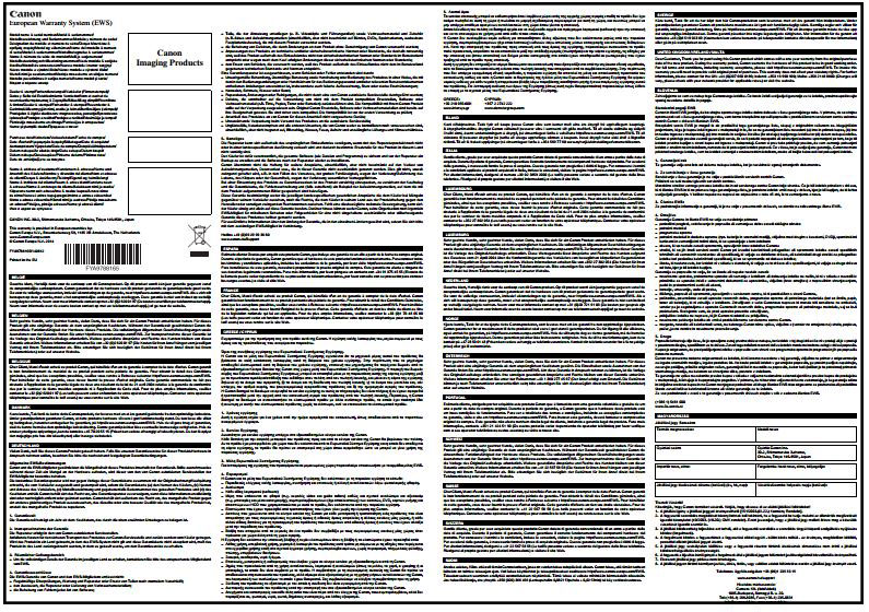 • Nie trzeba przekazywać żadnej dokumentacji do firmy Canon w celu zarejestrowania gwarancji w ramach Europejskiego Systemu Gwarancyjnego (EWS). Jeśli zechcesz zlecić naprawę gwarancyjną w ramach Europejskiego Systemu Gwarancyjnego (EWS), to zawsze trzeba będzie udostępnić firmie Canon oryginalny, ważny dowód zakupu (zawierający datę pierwotnego zakupu) danego produktu, a w niektórych przypadkach wymagana może być także wypełniona karta gwarancyjna. Szczegółowe wymagania należy sprawdzić w kontekście konkretnego kraju.